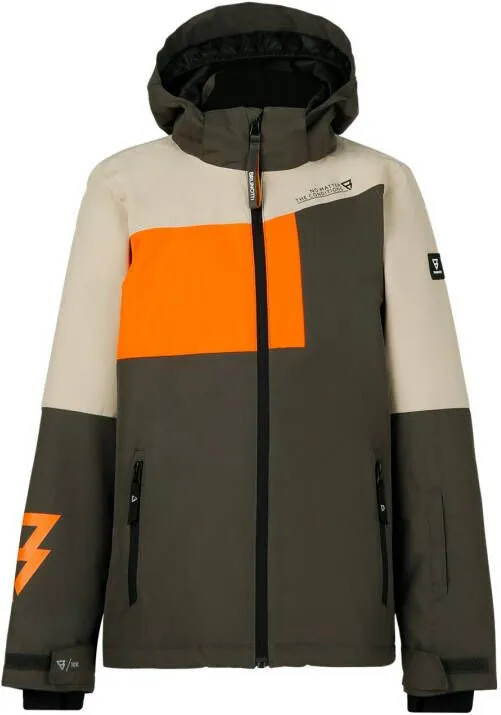 Dit jongens ski-jack Flynnery van Brunotti in een colorblock kleur groen is gemaakt van van waterafstotend gerecycled polyester (duurzaam). Het model heeft een afneembare capuchon, een ritssluiting, twee afsluitbare steekzakken en een skipaszak. Verder is deze veelzijdige ski-jas voorzien van een windstopper, getapete naden, elastische manchetten en de de mouwen zijn verstelbaar doormiddel van klittenband.