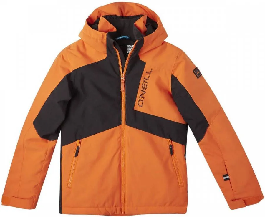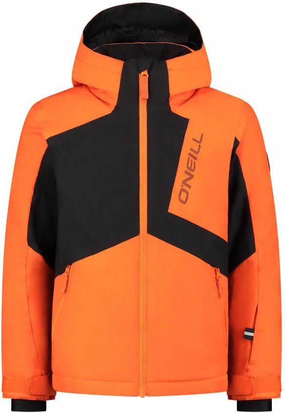 Specificaties: * Pasvorm: regular fit; ergonomisch gebogen naden zorgen voor veel bewegingsvrijheid * Waterdichtheid: waterdicht tot een waterkolom van 10.000mm; kritisch getapete naden * Temperatuurregeling: ademend vermogen van 10.000 g/m²/24u; warme voering * Rits: volledige ritssluiting * Zakken: twee zijzakken met ritssluiting; een zakje voor je liftpas; audiozak in de voering van de jas * Capuchon: vaste capuchon * Sneeuwvanger: vaste sneeuwvanger * Manchetten: met klittenband verstelbare manchetten en elastische binnenmanchetten aan de mouwen * Kleur: oranje zwart * Materiaal: 100% polyester (waarvan 45% gerecycled (REPREVE)) * Extra bijzonderheden: O’Neill Grow System; reflecterende details zorgen voor extra zichtbaarheid.