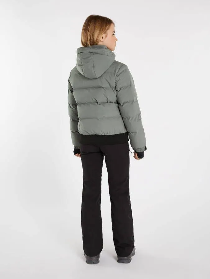 Specificaties: * Pasvorm: regular fit; hoge kraag; kort(er) model * Waterdichtheid: waterdicht tot een waterkolom van 10.000 mm; waterafstotend materiaal; geen getapete naden * Temperatuurregeling: ademend, vochtafvoerend en sneldrogend materiaal; ademend vermogen van 10.000 g/m²/24u; winddicht * Rits: volledige ritssluiting met kinbeschermer * Capuchon: vaste, verstelbare capuchon * Zakken: twee zijzakken met ritssluiting; een liftpaszak * Manchetten: met klittenband verstelbare manchetten aan de mouwen; elastische binnenmanchetten met duimgaten aan de mouwen * Sneeuwvanger: vaste sneeuwvanger * Kleur: groen/grijs * Materiaal: 100% polyester.