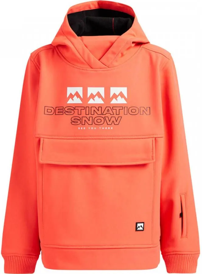 Een gewatteerd anorak van ademend materiaal dat warmte en vocht afvoert. Het ski-jack heeft een capuchon, een klepzak op het voorpand, een opdruk en fleece voering. De jas heeft lange mouwen, waarvan de linkermouw een zakje heeft.